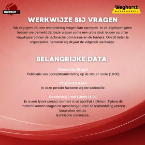 Op donderdag 30 april om 19:00 uur zal de technische commissie de conceptteamindeling bekend maken voor de senioren en ABC-jeugd.